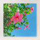Des fleurs d'hibiscus roses photographiées contre un ciel bleu clair. La lumière joue sur les pétales roses et les feuilles verts.