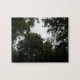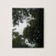 Ce superbe puzzle présente une photo prise à l'intérieur d'une forêt dense. La photo montre l'obscurité des arbres et une petite zone de ciel gris. Le résultat est une scène étrange et atmosphérique.