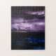 Foudre pourpre lumineuse vue la nuit au-dessus d'un océan bleu profond.