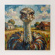 A cute puzzle with an impasto close up of an ostrich on a ranch.