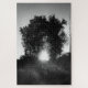 A black and white photograph of a natural tree arch witch light shining trough, creating the feeling of a quiet gateway between shadow and brightness. A calm, atmospheric image with a sense of mystery and transition.