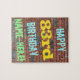 Cette conception amusante de puzzle sur le thème de l'anniversaire comporte un message comme "HAPPY 83rd BANTHDAY, NAME-HERE!", où le nom peut être personnalisé. L'arrière - plan est représenté par un mur en brique composé de briques de couleur rougeâtre. Le texte du message personnalisable comporte des couleurs comme le bleu, le jaune et le vert, et il a un aspect inspiré de celui des graffitis peints. Un puzzle comme celui-ci pourrait être utilisé comme une façon amusante d'envoyer des voeux d'anniversaire à quelqu'un qui célèbre son quatre-vingt-troisième anniversaire, et qui peut-être aime vraiment faire des casse-tête. [~Z0000285]