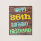 Cette conception amusante de puzzle sur le thème de l'anniversaire comporte un message comme "HAPPY 86th BIRTHDAY, FIRSTNAME!", où le nom peut être personnalisé. L'arrière - plan est représenté par un mur en brique composé de briques de couleur rougeâtre. Le texte du message personnalisable comporte des couleurs comme le bleu, le jaune et le vert, et il a un aspect inspiré de celui des graffitis peints. Un puzzle comme celui-ci pourrait être utilisé comme une façon amusante d'envoyer des voeux d'anniversaire à quelqu'un qui célèbre son quatre-vingt-sixième anniversaire, et qui peut-être aime vraiment faire des casse-tête. [~Z0000285]