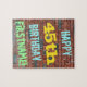 Cette conception de puzzle amusant sur le thème d'un anniversaire comporte un message comme "JOYEUX 45e ANNIVERSAIRE, PRÉNOM !", où le nom peut être personnalisé. L'arrière-plan représente un mur de briques constitué de briques de couleur brun rougeâtre. Le texte du message personnalisable présente des couleurs comme le bleu, le jaune et le vert, et son apparence est inspirée de celle des graffitis peints. Un puzzle comme celui-ci pourrait être utilisé comme un moyen amusant d'envoyer des vœux d'anniversaire à quelqu'un qui célèbre son quarante-cinquième anniversaire et qui aime peut-être vraiment faire des puzzles.