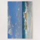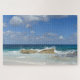 "Great Guana Cay Beach, Bahamas" de Catherine Sherman. Des vagues se sont écrasées sur des rochers calcaires sur une plage derrière le Nipper's Beach Bar and Grill sur Great Guana Cay dans les îles Bahamas des Caraïbes. De beaux nuages moelleux ornent le ciel bleu vif. L'eau est de plusieurs tons bleu et le sable est d'un blanc crémeux. Great Guana Cay, une île barrière, est un îlot long et étroit, long de 11 km, Il est au centre des îles Abaco. Il est à environ 12 km de Marsh Harbour sur Great Abaco Island, qui possède un petit aéroport international. Environ 150 personnes vivent sur l'île, la plupart le long de la bande de plage de 8 km et demi. Le Commonwealth des Bahamas est un groupe d'environ 700 îles et près de 2 500 îlots ou cayes reposant sur un immense plateau de calcaire tertiaire qui s'est formé il y a entre 1 et 2 millions d'années. Les Bahamas ne sont pas volcaniques comme la plupart des îles des Caraïbes et du Pacifique. Le calcaire est le seul rocher que l'on trouve aux Bahamas et est souvent usé rasoir aiguisé par l'action du vent et de la mer. Sous l'eau et le long des paysages côtiers sont le résultat de la croissance corallienne sur le plateau de calcaire.La croissance des récifs coralliens sur le plateau de calcaire compte pour les belles eaux claires des Bahamas. L'action des vagues au cours des siècles a créé les plages blanches extraordinaires composées de minuscules fragments de corail, de coquillages et de calcaire.
