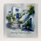 Image aquarelle d'une scène de l'île de Mykonos, Grèce. Un arrière - plan satiné blanc complète le cadre.