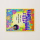 Invitation de puzzle amusante et colorée de 8" x 10" avec le texte, "fête d'anniversaire Super" imprimé en lettrage amusant style 60s sur un arrière - plan orange, jaune, vert et bleu avec une variété d'images de fleurs les années 70. Dans le coin inférieur droit se trouve une femme avec une grande afro et des boucles d'oreilles pendantes soulevant un verre à martini. Customisez avec les détails de votre fête. Voir toute la collection Disco les années 70 Puzzle dans ACTIVITIES | Section Puzzles.