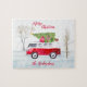 Red Truck Joyeux puzzle de Noël. Personnalisez en ajoutant votre nom de famille et en changeant la phrase Joyeux Noël. Éléments correspondants disponibles.