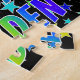 Ce puzzle animé, amusant et sur le thème de l'anniversaire présente le message "HAPPY BANTHDAY, KAYDEN" avec les personnages ayant un motif dégradé coloré inspiré du spectre arc-en-ciel, ainsi qu'un motif arrière - plan de terrain étoilé dynamique. Un puzzle vibrant comme celui-ci pourrait être une façon amusante d'envoyer des voeux d'anniversaire à quelqu'un nommé Kayden. [~Z0000468]