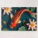 Un magnifique koi orange avec or mettant en valeur ses écailles nage parmi les nénuphars crème et rose sur ce magnifique puzzle de scie. Parfait pour tous ceux qui aiment les jardins et les étangs de koi.