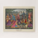 Puzzle de 20" x 16" du Bengale-Occidental, Calcutta, 1878-1883. Dans ce curieux sujet, Krishna apparaît sous le couvert de Kali, quatre-armés, portant des guirlandes macabres et avec une langue rouge projetante, adoré par son amant [secret] Radha vu par d'autres servantes de vache (gopis) du clan Yadavas dans un vernis de forêt. La véritable identité de Krishna est néanmoins évoquée par les traits de paon qu’il porte dans son diadème, sans parler de sa pose nonchalante. L'histoire raconte que le mari de Radha entend parler de son alliance avec Krishna et se précipite pour affronter son amant, mais avant son arrivée (on voit qu'il entre en haut à droite) Krishna se transforme en Kali et ordonne à Radha de se comporter comme s'il jouait un puja (culte rituel). Le mari enragé est trompé par ce stratagème et s’émeut d’entendre la piété de sa femme dans le culte de la divinité familiale. La composition et le cadre ont toutes les caractéristiques d'une scène victorienne, avec en toile de fond un paysage peint. Voir l'ensemble de la collection Puzzle des Lumières dans les ACTIVITÉS | Section Puzzles.