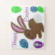 Pâques Bunny puzzle pour les garçons et les filles avec un lapin brun mignon lapin avec de grandes oreilles roses et une queue bosselée sautant par pour vous souhaiter une Pâques heureuse. De jolis oeufs de Pâques décorés sont sur son sentier en pois bleus, oeuf rayé vert, et joli oeuf violet avec fleur verte et fleur de parchemin blanc. Avec le libellé, Joyeux Pâques écrit en violet texte. Un puzzle de Pâques amusant fait un beau cadeau pour les garçons ou les filles, belle idée Pâques Panier. Art Graphique original Dessins numériques peints à la main © 2013-2016 TamiraZDesigns.