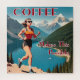 Vous courrez sur de hautes montagnes et faites des courses ultra-courantes à cause du café et du café seul. Ce superbe design montre un coureur dans les montagnes dans le style d'une affiche de voyage rétro vintage.