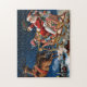 Un puzzle vintage avec du charme de Noël comportant le père noël montant son traîneau complètement des jouets au-dessus d'une ville d'hiver.