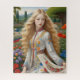 ce portrait exquis de style Renaissance présente une figure assise habillée d'une robe à flot avec des motifs complexes et un bleu riche L'arrière - plan présente un jardin idyllique avec des fleurs luxuriantes, capturant l'essence de l'art Renaissance avec son attention aux détails et aux couleurs vives.