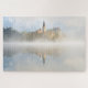 Photo puzzle d'un lever de soleil brumeux au lac Bled avec réflexion de l'île avec l'église dans l'eau calme du lac et avec Bled Castle dans l'arrière - plan sur une belle journée d'automne en Slovénie.