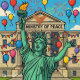 Un design satirique puissant : La Statue de la Liberté célèbre joyeusement devant le grand Ministère de la Paix, entouré de ballons, feux d'artifice et décorations festives. Cette oeuvre audacieuse de style dessin animé contraste l'optimisme avec la dure vérité, mêlant humour, symbolisme et commentaires politiques. Parfait pour les vêtements, les affiches, les tasses et autres objets POD pour ceux qui aiment l'art expressif et inspirant.