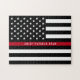 Ce puzzle d'amusement comporte une ligne rouge mince de sapeur-pompier noir et blanc conception de drapeau américain avec la bannière étoilée sur un arrière - plan noir et un nom pour que vous personnalisiez. Fait un cadeau unique.