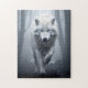 Un loup blanc majestueux aux yeux bleus percevants se dirige vers le spectateur dans une forêt dense et brumeuse. La fourrure du loup est blanche et immaculée, contrastant fortement avec les arbres sombres et ombragés et l'atmosphère brumeuse. Le regard du loup est intense et ciblé, et il exprime un sentiment de puissance et de détermination. Un cadeau parfait pour les amateurs de loups