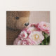 Un vieux ours doux prend du temps à sentir un bouquet de roses rose pâle