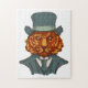 Un tigre portant un costume turquoise et un chapeau supérieur est représenté contre un arrière - plan muet, donnant un aspect élégant et fantaisiste. L'expression sérieuse de l'animal est soulignée par la tenue formelle.