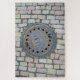 "Prague Manhole Cover, Prague Castle Complex, Prague, République tchèque" par Catherine Sherman. Une couverture de trou d'homme avec un design et un texte complexes est intégrée dans une rue pavée dans le Complexe Château de Prague, Prague, République Tchèque. Le capot de vidange présente les motifs architecturaux des armoiries de Prague et est entouré de motifs en pierre claire et foncée.