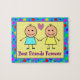 Joli puzzle coloré de deux meilleurs amis pour toujours. L'accent principal est mis sur deux filles, l'une en robe bleue et l'autre en robe jaune. Entre eux se trouve un coeur d'amour rose mignon. Ils se trouvent à l'intérieur d'un rectangle jaune encadré d'un cadre à pois multicolores.