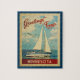 Ce voeu de voyage du Minnesota design nautique vintage comprend un bateau naviguant sur l'eau avec des mouettes et un ciel bleu rempli de somptueux nuages blancs bouffants.