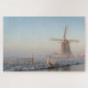 Casse-tête d'une photographie d'un moulin à vent néerlandais traditionnel avec une barrière couverte dans la neige dans un paysage rural dans Pays-Bas, en hiver dans la lumière de début de la matinée au lever de soleil.