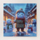 Un charmant bonhomme de neige aux joues roses, vêtu de vêtements chauds d'hiver, trône fièrement au milieu d'un village enneigé. Il est entouré de ses créations : trois adorables bonhomme de neige de tailles différentes. La lumière chaleureuse des maisons du village illumine la scène, créant une atmosphère cosy et festive.