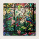 Ce magnifique décor en vitrail est orné d'oiseaux colorés perchés parmi des plantes en fleurs.