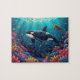 Highly vibrant and colorful digital illustration of a lively underwater scene featuring a large orca whale and a sea turtle swimming over a dense, multi-colored coral reef teeming with tropical fish. Captures the beauty and biodiversity of a healthy ocean environment. Ideal for marine biology enthusiasts, divers, ocean conservationists, and fans of detailed, colorful nature art.