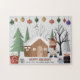 Ours et arbres d'hiver Joyeux Noël puzzle qui présente un ours en vêtements d'hiver, une maison, des arbres, des cadeaux et des ornements.