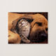 Puzzle de jeu montré avec une photo d'un chaton mignon et chien étant des potes de musculation. Customisez cet objet ou achetez tel quel. Image stock