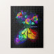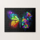 Arc en ciel, papillon monarque lumineux, artistiquement peint avec bouquet de roses irisés, lumineux, lumineux sur arrière - plan noir. Papillon arc-en-ciel.