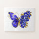 Bijoux, bleu, saphir, papillon aux fleurs pétillantes avec aile décorée de bleu, fleurs précieuses avec feuilles d'or sur arrière - plan blanc.