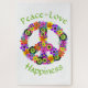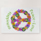Ce puzzle boho jigsaw présente un signe de paix floral dans les tons rose, jaune, orange, violet, vert, blanc, noir et turquoise. "Paix, amour et bonheur" entourent le signe de paix.