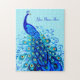 Puzzle dans un paon d'imaginaire avec une queue somptueuse, dans les nuances de bleu turquoise et cobalt profond, sur un arrière - plan d'aqua doux avec texte personnalisable