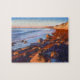 Peinture d'une plage rocheuse aux eaux océaniques calmes à l'aube.