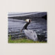 Dans des tons doux de bleus, gris et marron, le pélican brun, sur la photo originale de MaeFlowers sur ce Puzzle, pose au bord de l'eau, attendant que les poissons se baignent. La lumière réfléchit les plumes brillantes et met en évidence les ondulations dans l'eau. Un peu d'herbe verte sur le fond finit la photo.