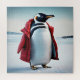 Pingouin arctique avec un manteau rouge sur glace.
