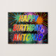 Ce puzzle dynamique, amusant, sur le thème de l'anniversaire a le message "HAPPY BANTHDAY, ANTONIO" avec un spectre coloré arc-en-ciel inspiré motif dégradé, et un feu d'artifice célébré animé inspiré motif arrière - plan. Un puzzle coloré comme celui-ci pourrait être une façon amusante d'envoyer un message de voeux d'anniversaire à quelqu'un nommé Antonio. [~Z0000465]
