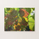 A single grape leaf is turning red on the vine. In the background are green leaves and purple grapes below. Sunlight glows through the leaves throwing shadows on the subject leaf.