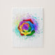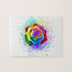 Grand rose fleuri avec pétales arc-en-ciel sur arrière - plan blanc, peint sur des éclaboussures de peinture colorée et lumineuse. 3d
