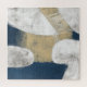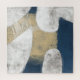 Une grande forme abstraite en bleu marine recouvre la toile d'un bout à l'autre avec des coutures révélant un arrière - plan blanc texturé. Une zone beige texturée et usée est assise sur la forme bleue tandis que les lignes blanches se tortillent comme une corde dans une finition dynamique à la pièce.