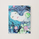 Ce puzzle d'amusement a une illustration d'une jeune sirène bleue. Elle est entourée par les protections de lis vertes et les fleurs roses avec ses cheveux entrant dans l'eau. Grand pour une nuit ou n'importe qui de jeu de famille qui rassemblent des sirènes.