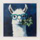 Playful twist to cute animal art and humor with a quirky white llama rocking teal glasses and holding a leafy branch.