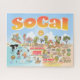 Une scène lumineuse et colorée offre une vue spectaculaire de la Californie du Sud - personnages farfelus sur la plage et le désert de SoCal présentant Los Angeles, Orange County, San Diego, Père Noël Barbara, Riverside, Palm Springs, El Centro, Anza Borrego et Joshua Tree parcs ainsi que les villes frontalières de Tijuana, Tecate et Mexicali. Cette scène pleine de charme a tout - un surfeur pend dix tandis qu'un orque saute de l'eau, des animaux de zoo accueillent les touristes, un couple de plage musclé à flex pour impressionner comme un T-Rex rugit un défi et un réservoir se met en position et bien plus encore...