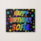 Ce design amusant et passionnant de puzzle sur le thème de l'anniversaire comprend le message "HAPPY BANTHDAY, SOFIA" avec les personnages ayant un spectre coloré arc-en-ciel inspiré motif dégradé, ainsi qu'un motif arrière - plan étoiles vibrant. Un puzzle vibrant comme celui-ci pourrait être utilisé pour envoyer des voeux d'anniversaire à quelqu'un du nom de Sofia. [~Z0000468]