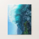 Une vague massive saute des mers agitées, brillant blanc et bleu et turquoise dans la lumière du soleil. Sous la vague, sur le point d'être submergée, se trouve une petite ville avec un château et des cottages médiévaux construits sur un promontoire rocheux.